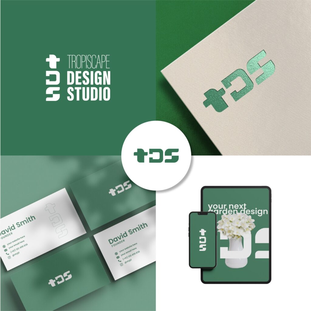 A bold and modern identity created for a landscape design studio. The branding reflects clean design and strong structure, making it look creative yet professional across all touchpoints — from business cards to digital screens.