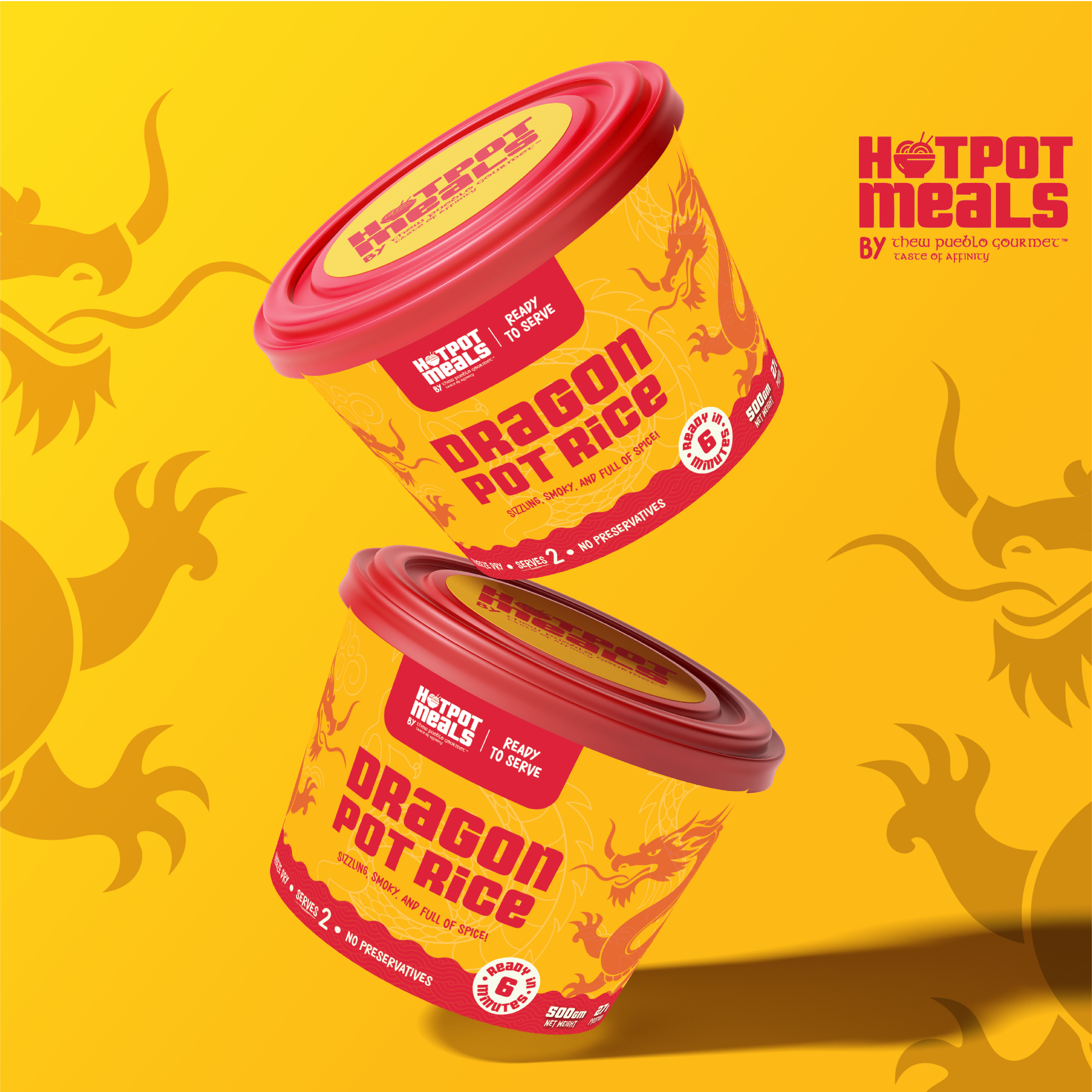A modern and appetizing design created for Hotpot Meals’ Dragon Pot Rice. The bold colors and Asian-inspired elements make the packaging stand out, reflecting the rich flavor and heat of the dish inside.