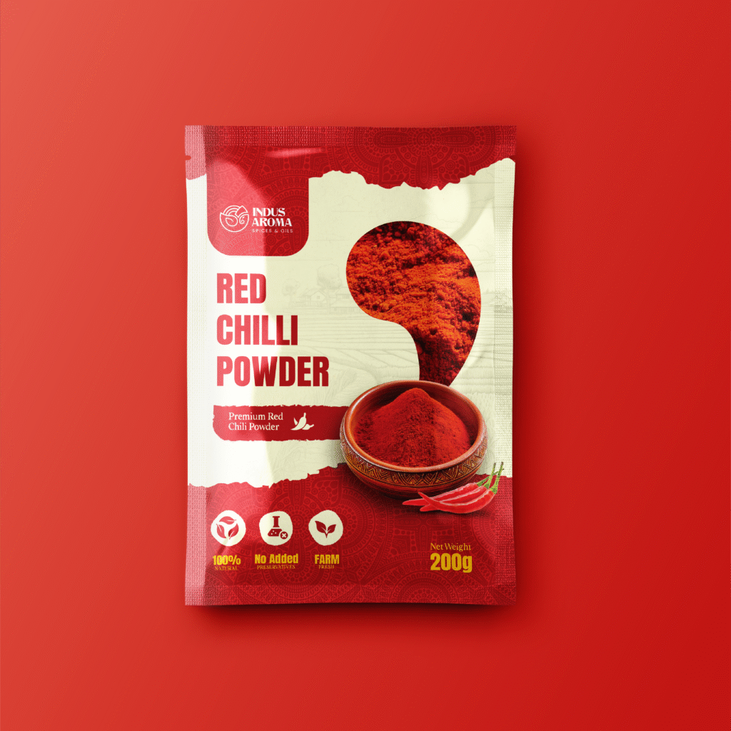 A bold and vibrant design made for Indus Aroma’s chilly powder. The packaging highlights the product’s freshness and spice with rich red tones and strong visuals, giving it a sharp and authentic look for the Indian kitchen.